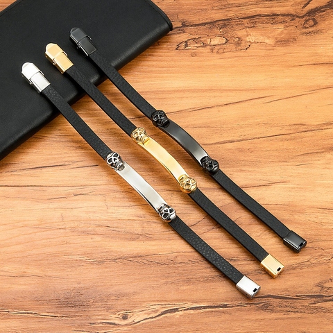 Simples Alta Qualidade Nova Geometria De Moda Crânio De Aço Inoxidável Fecho Magnético Real Pulseira De Couro Genuíno para Homens